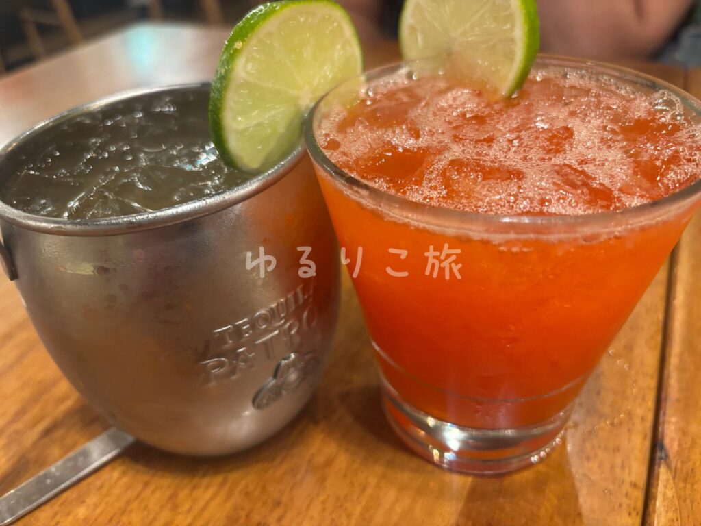 娘はマンゴージュース、私はピンクマルガリータ、パパはジントニックで乾杯しました。