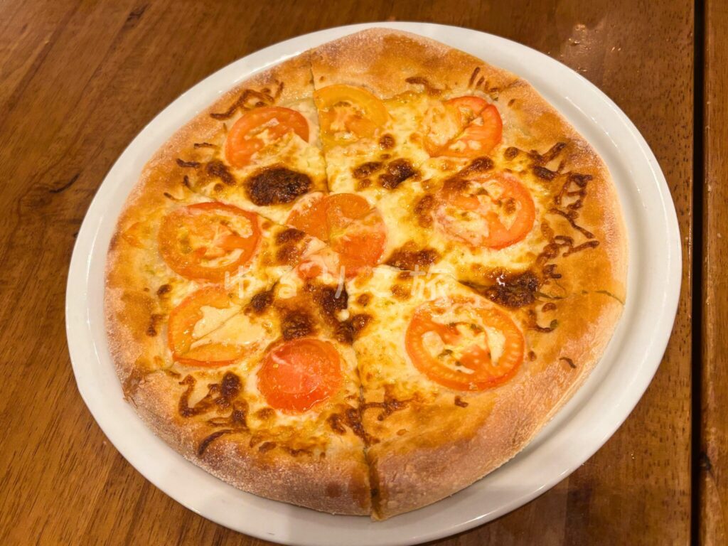 食事は娘はマカロニチーズ、大人はピザを注文。